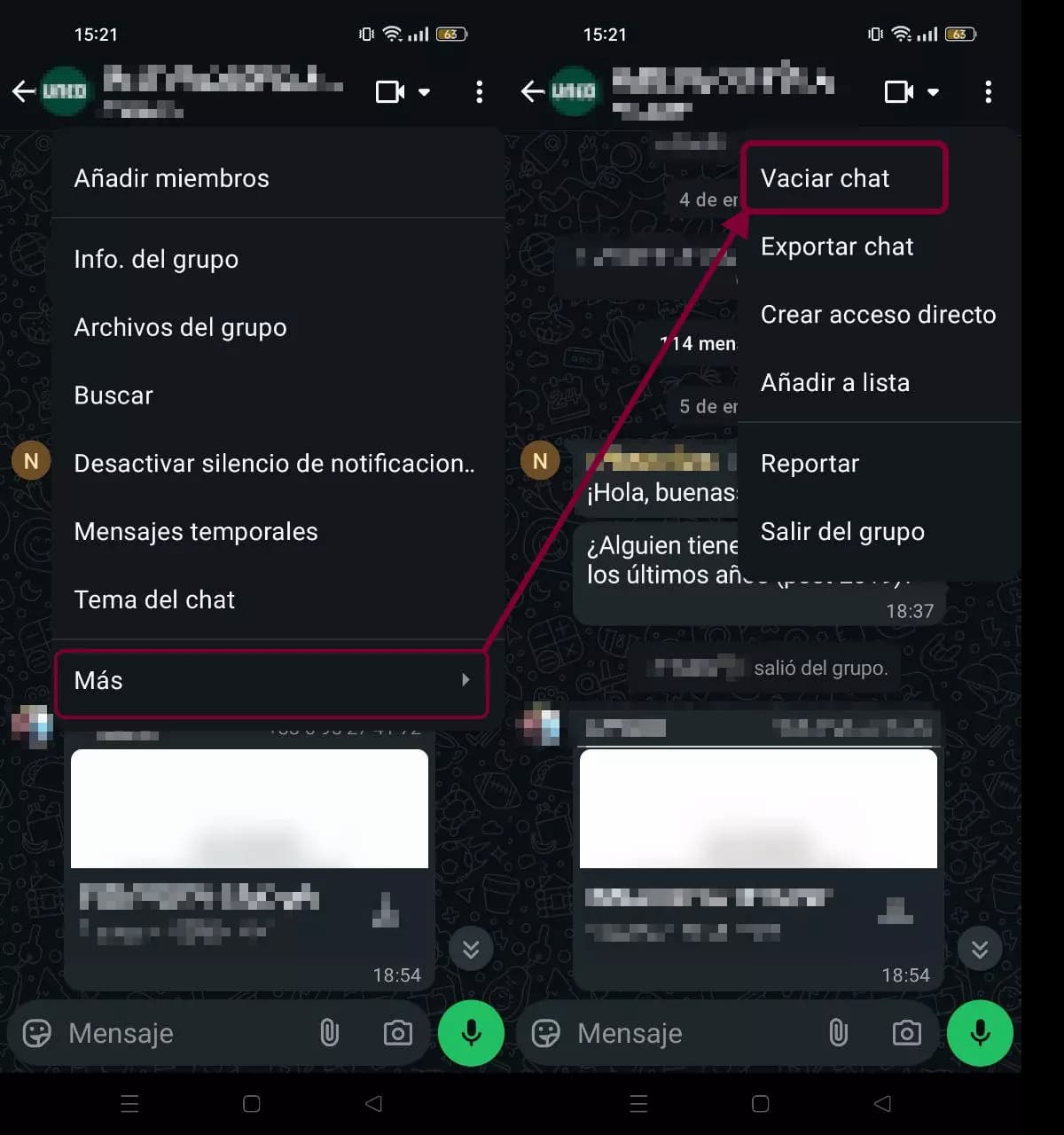 - Selecciona 'Más' > 'Vaciar chat'.