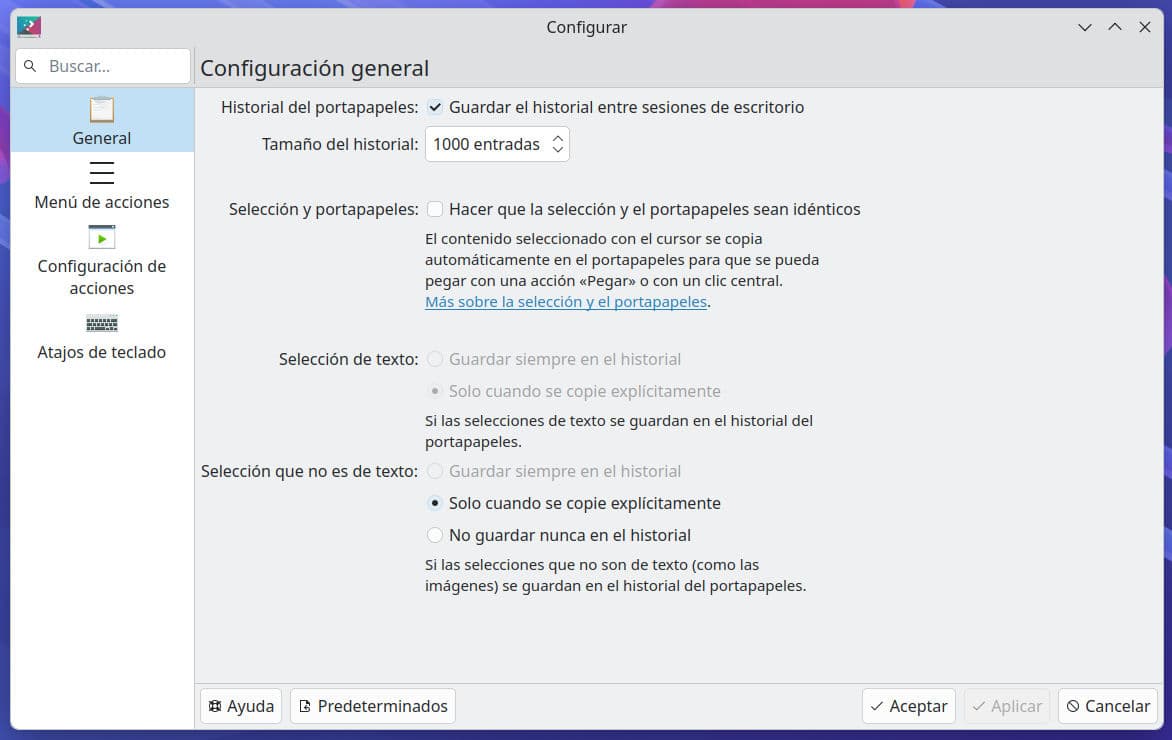 En el apartado «General» están dos de las opciones elementales de la aplicación: «tamaño del historial» y «selección y portapapeles». La primera, al gusto, pero no te quedes en las 20 entradas predeterminadas, ni temas aumentarlo tanto como quieras, puesto que apenas gasta espacio cuando lo necesites, ahí lo tendrás. Yo, por ejemplo, suelo dejarlo en 1.000 entradas.