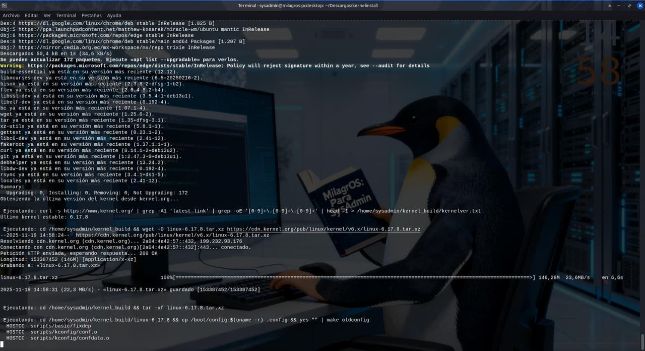 Instala los paquetes, descarga el kernel, lo configura para Debian 12/13 (y otras como: MX Linux, Linux Mint LMDE, Linux Mint, Ubuntu, ElementaryOS y PopOS!, por ahora), luego genera la imagen en formato «.deb» con el header, lo instala y lo único que el usuario tiene que hacer es reiniciar el sistema y elegir el nuevo kernel desde el menú de grub. Compilando e instalando el kernel Linux – ¿Por qué? No hay porque.