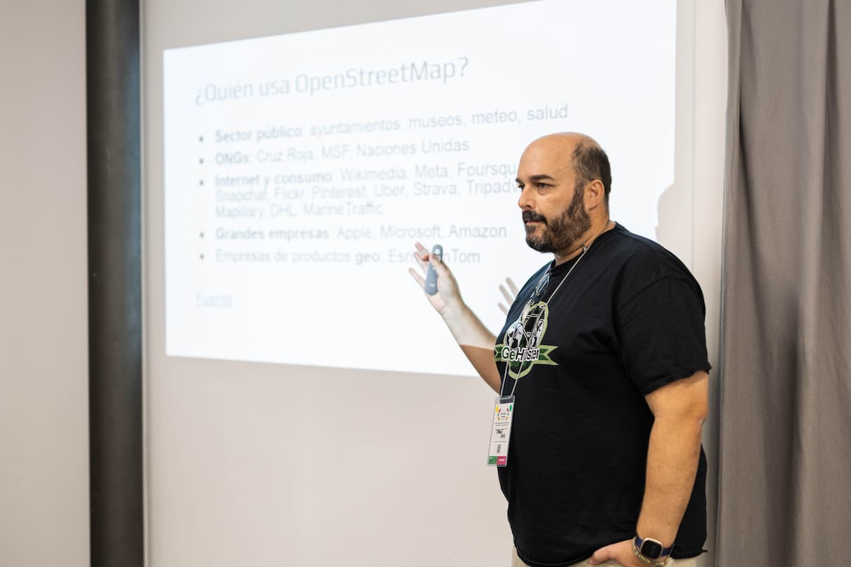 En dicha sala exponía Jorge Sanz, miembro de la Fundación OSGeo y Geoinquietos y colaborador en OpenStreetMap y Carmen Diez, Geochica en OpenStreetMap y miembro de OSGeo, Geoinquietos y QGIS España, con una charla que me encantó ya que toca dos temas candentes en mi vida «Un mapa para todos: breve introducción a OpenStreetMap y el proyecto Las Calles de las Mujeres«. Soy un forofo de la geolocalización y estoy 100% concienciado en que debemos dar visibilidad al sexo femenino en todos los ámbitos de nuestra vida.